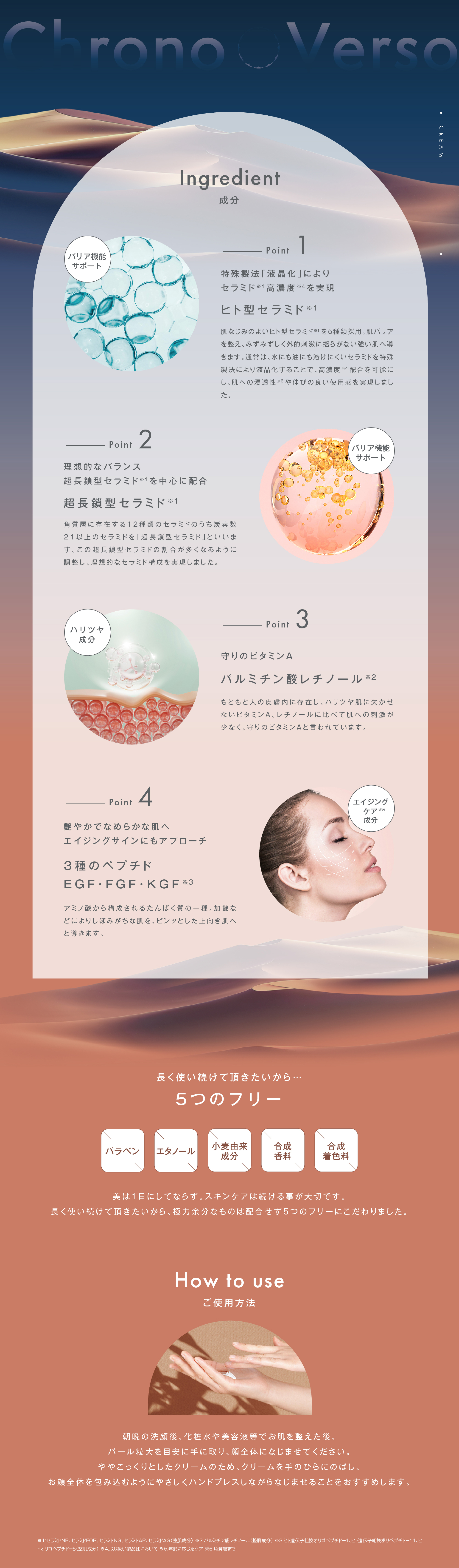 | 特徴 | 肌バリアを整えるヒト型セラミド※1を特殊製法により1 % 以上配合した高保湿クリームです。 様々な刺激から肌を守り、美しくキメの整った肌へ導きます。また、パルミチン酸レチノール※2や成長因子※3~5により肌にふっくらとしたハリをもたらし、 様々な肌悩みにアプローチします。こっくりとしながらもべたつかないテクスチャーです。 ※1:セラミドNP、セラミドEOP、セラミドNG、セラミドAP、セラミドAG(整肌成分)※2:パルミチン酸レチノール(整肌成分)※3:ヒト遺伝子組換オリゴペプチド-1(整肌成分)※4:ヒト遺伝子組換ポリペプチド-11(整肌成分)※5:ヒトオリゴペプチド-5(整肌成分) |